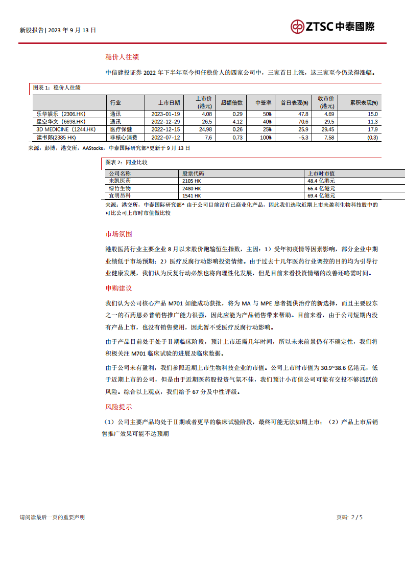 由于公司目前没有已商业化产品,估值主要参照近期上市的未盈利生物科技股。友芝友生物的上市时市值为30.88亿至38.60亿港元,低于近期上市的可比公司。在当前医药股投资气氛不佳的市场环境下,小市值公司可能面临交投不够活跃的风险。