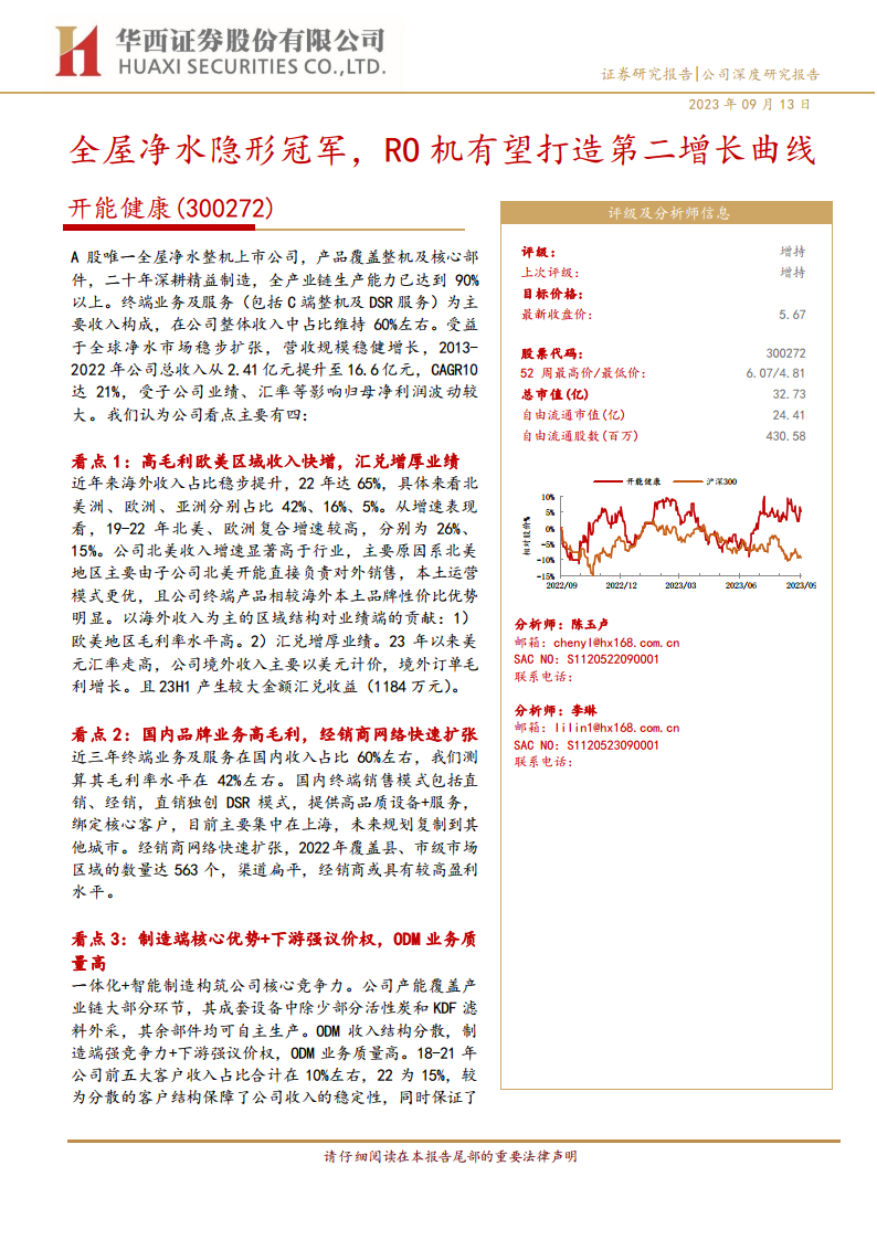 华西证券维持对开能健康的“增持”评级。预计公司2023-2025年营业收入将分别达到17.89亿元、20.09亿元和22.77亿元,同比分别增长7.7%、12.3%和13.4%。归属于母公司净利润预计分别为1.25亿元、1.45亿元和1.62亿元,同比分别增长34.7%、15.8%和12.3%。以2023年9月13日收盘价5.67元计算,公司对应2023年市盈率(PE)为26.2倍,低于可比公司平均33倍。