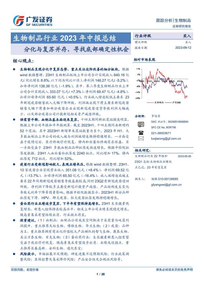 生物制品行业2023年中报总结:分化与复苏并存,寻找底部确定性机会