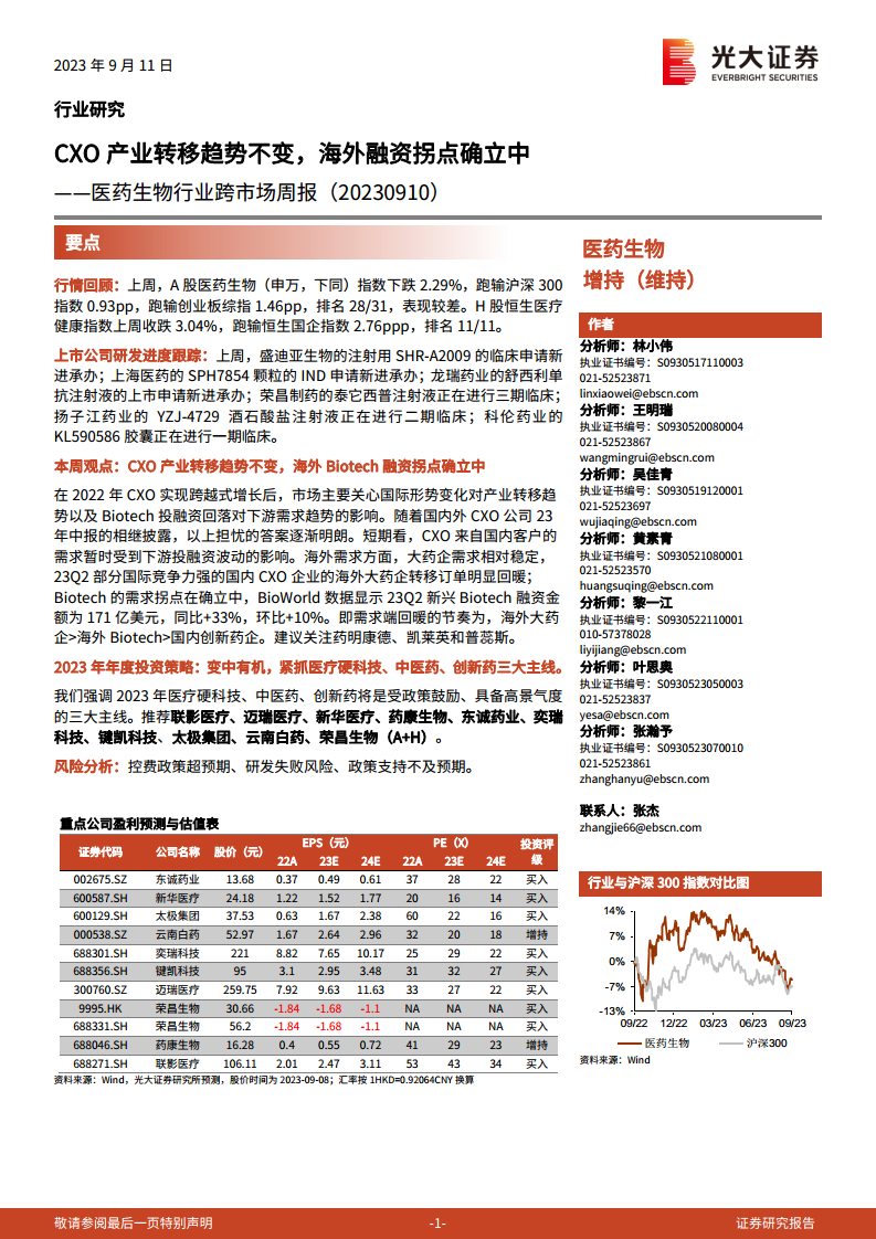 医药生物行业跨市场周报:CXO产业转移趋势不变,海外融资拐点确立中