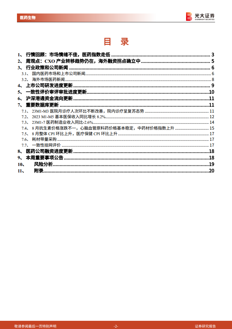 本报告深入分析了当前医药生物行业的市场动态、产业趋势及宏观经济影响。尽管近期市场情绪低迷导致医药指数表现不佳,但CXO产业的全球转移趋势依然强劲,特别是海外Biotech融资的拐点已确立,预示着未来下游需求的逐步回暖。在投资策略上,报告建议聚焦医疗硬科技、中医药和创新药三大高景气度主线。同时,通过对医院诊疗数据、医保收支、医药制造业经济指标、原料药价格及CPI等数据的统计分析,揭示了院内诊疗的复苏态势和行业面临的结构性调整。政策方面,耗材带量采购持续推进,上市公司研发和融资活动活跃,但潜在的政策风险和研发失败风险仍需警惕。
