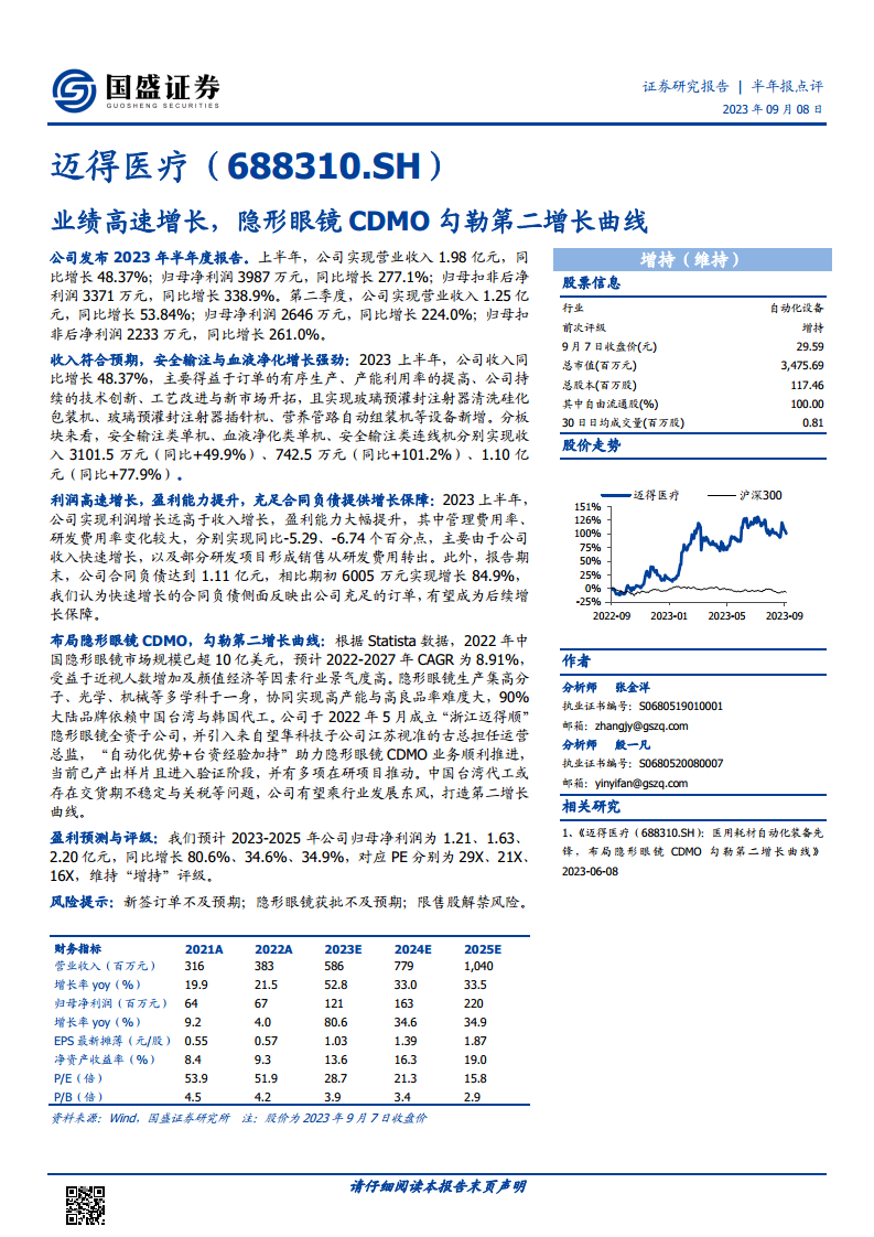 迈得医疗2023年上半年表现出强劲的业绩增长势头,核心业务收入和净利润均实现大幅提升,盈利能力显著改善。公司通过技术创新和市场拓展巩固了在安全输注和血液净化自动化设备领域的优势。同时,公司积极响应市场需求,战略性进入高增长的隐形眼镜CDMO市场,凭借其自动化技术和专业团队,有望抓住行业机遇,成功开辟新的增长极,为未来发展奠定坚实基础。国盛证券维持“增持”评级,并预计公司2023-2025年归母净利润将持续增长,分别为1.21亿元、1.63亿元和2.20亿元。