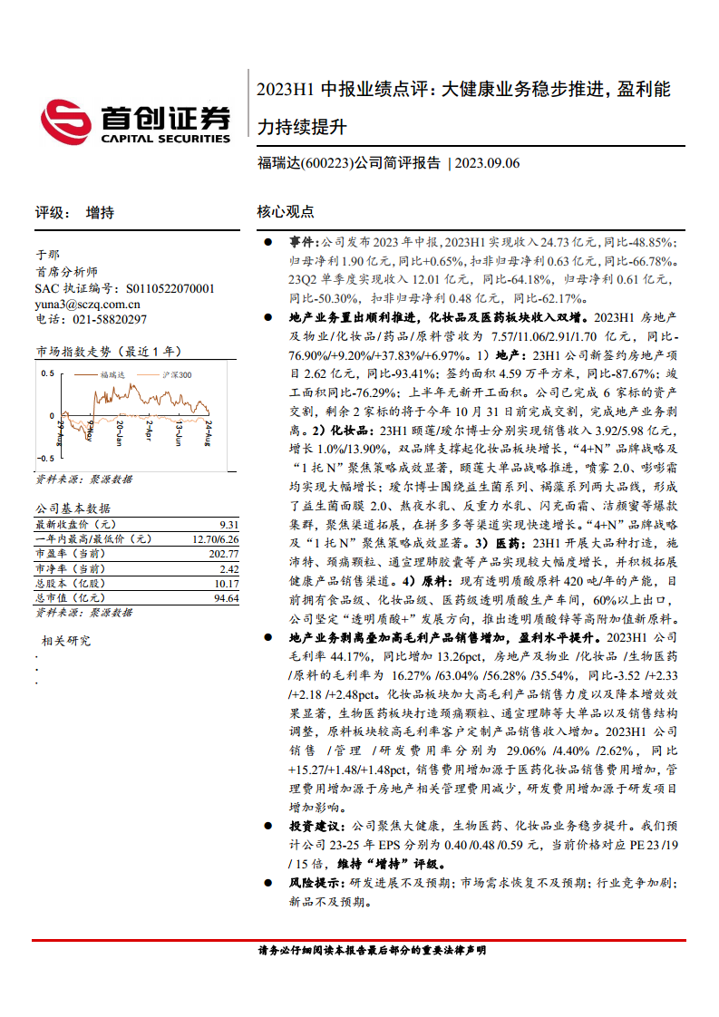 公司简评报告:2023H1中报业绩点评:大健康业务稳步推进,盈利能力持续提升
