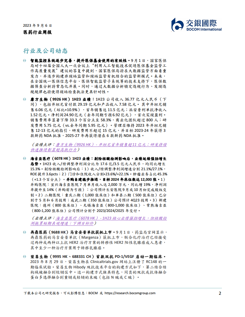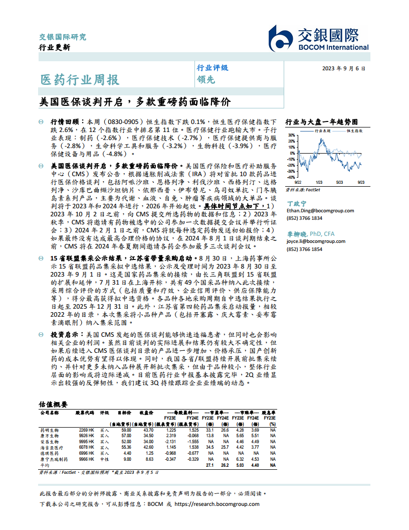 目前医药行业中报基本披露完毕,2Q业绩显示出较强的反弹韧性,建议3Q持续跟踪企业业绩端的动态。从板块估值来看,截至2023年9月5日,港股医疗保健行业市盈率TTM,制药板块为32.5倍,生命科学工具与服务板块为29.8倍,生物科技板块为-31.6倍,医疗保健设备与用品板块为-157.3倍,医疗保健提供商与服务板块为15.8倍,医疗保健技术板块为-10.6倍。交银国际覆盖的医药行业公司中,药明生物、康方生物、荣昌生物、海吉亚医疗和德琪医药均获得“买入”评级,康宁杰瑞制药为“中性”评级,显示出对部分创新型和高成长性企业的看好。