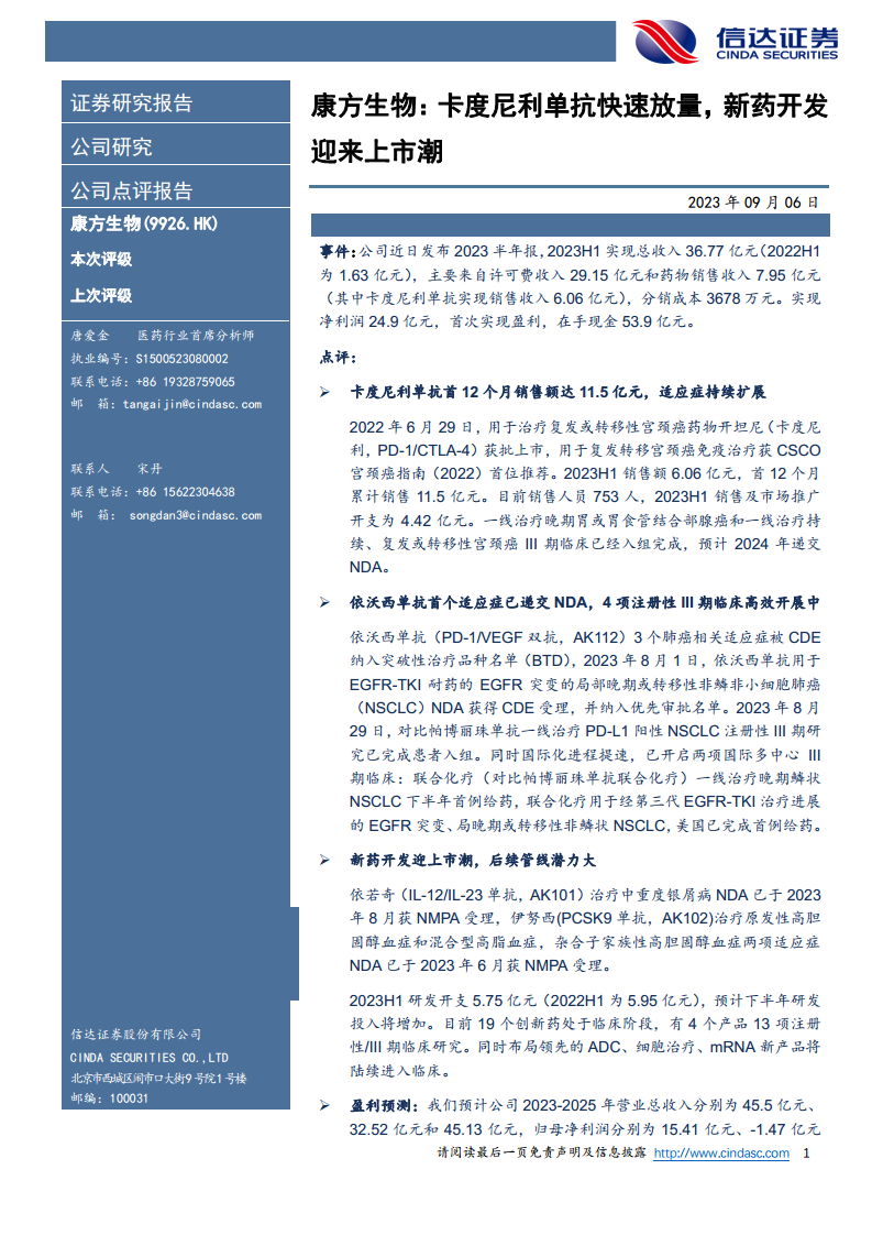 康方生物(09926):卡度尼利单抗快速放量,新药开发迎来上市潮