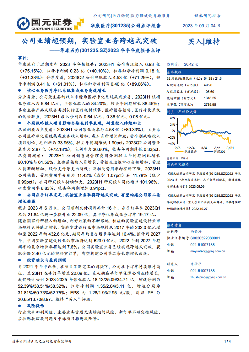 华康医疗2023年上半年业绩表现亮眼,营收和净利润均实现高速增长,核心医疗净化系统集成业务是主要驱动力。尽管战略投入项目短期影响毛利率,但公司费用率有所下降,且研发投入持续加大,显示出其对长期发展的战略布局。在手订单充足为未来业绩增长提供保障,而实验室业务的跨越式突破则有望成为公司新的增长引擎。基于此,分析师维持“买入”评级,并对公司未来三年的盈利能力持乐观预期,但同时提示了行业竞争、资质续期、订单不确定性及应收账款等潜在风险。