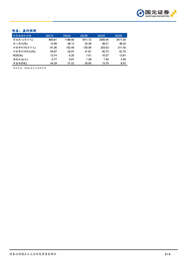 基于公司在手订单充足以及核心业务和新业务的良好发展态势,分析师维持对华康医疗的“买入”评级。预计公司2023年至2025年的营业收入将分别达到18.12亿元、25.09亿元和34.71亿元,增速分别为52.39%、38.51%和38.32%。归属于母公司净利润预计分别为1.35亿元、2.04亿元和3.11亿元,增速分别为31.81%、50.73%和52.75%。对应的每股收益(EPS)分别为1.28元、1.93元和2.95元,市盈率(P/E)分别为20.65倍、13.70倍和8.97倍。