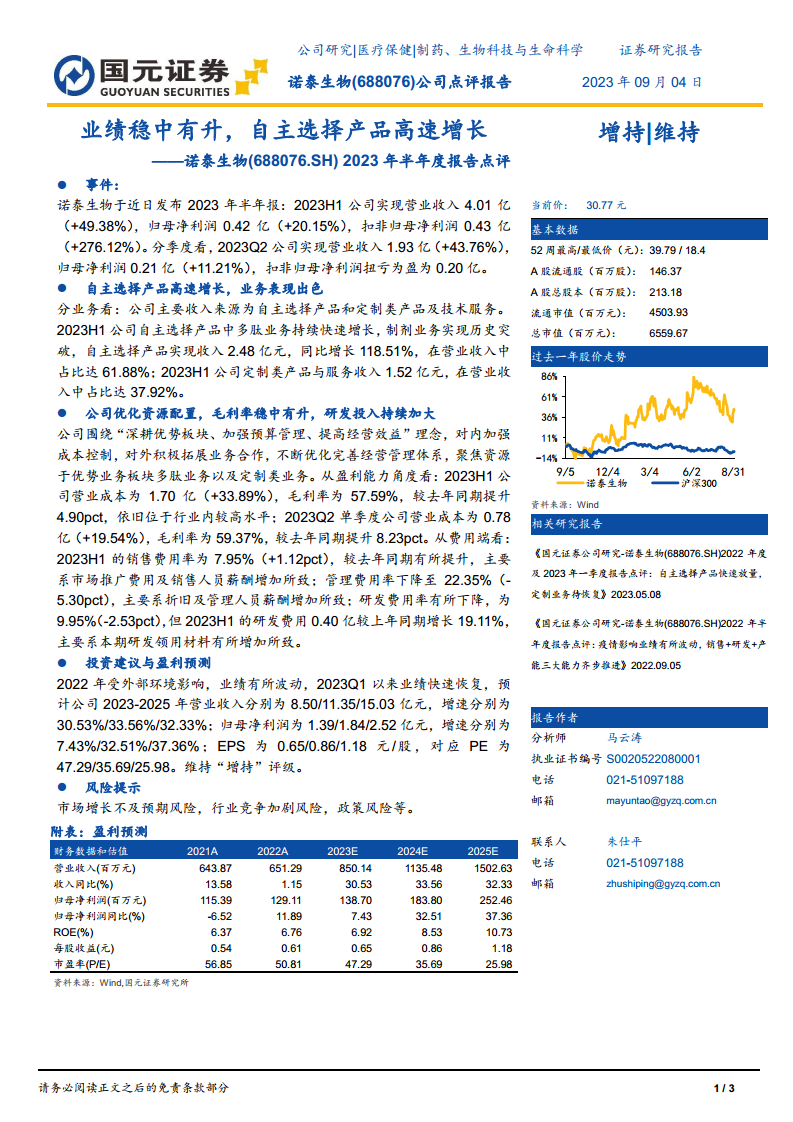 诺泰生物在2023年上半年取得了显著的经营成果,营业收入和扣非归母净利润均实现高速增长,其中自主选择产品业务是主要驱动力。公司通过优化资源配置、强化成本控制,有效提升了毛利率,并持续加大研发投入,展现出稳健的盈利能力和创新潜力。尽管面临市场和政策风险,但基于其强劲的业绩表现和清晰的增长路径,预计公司未来将保持良好的发展态势,因此报告维持“增持”评级。