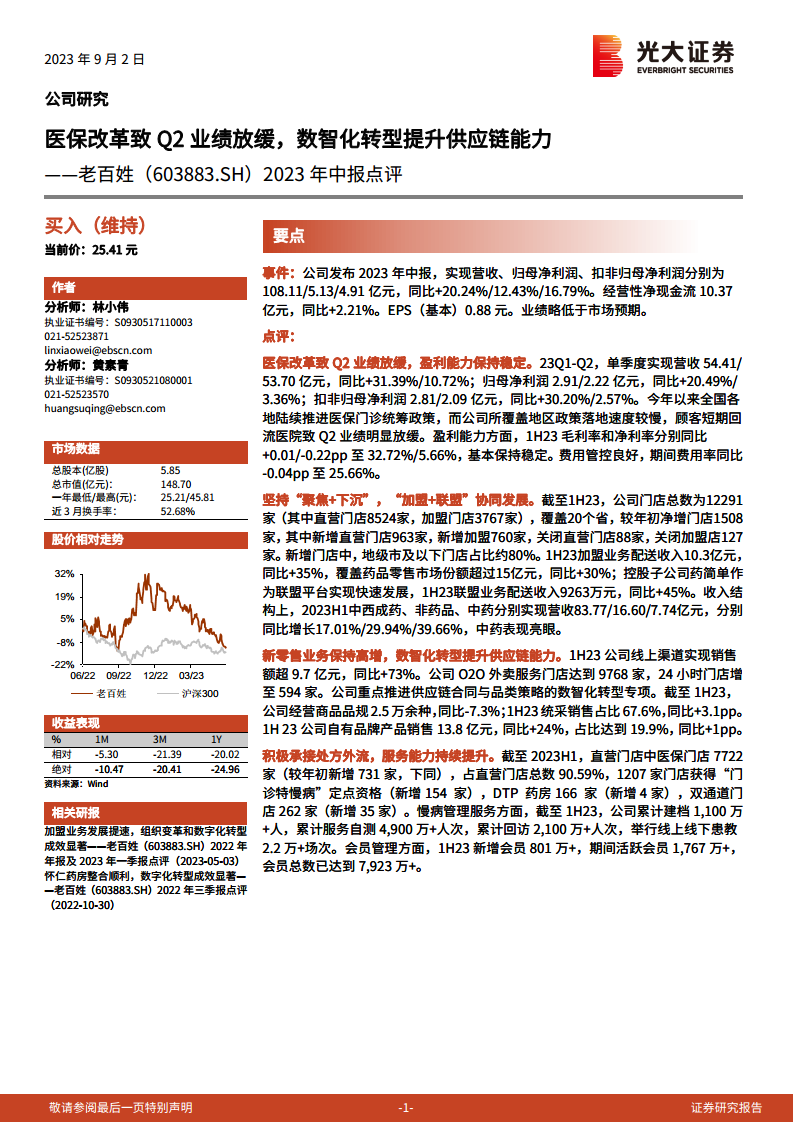 老百姓(603883)2023年中报点评:医保改革致Q2业绩放缓,数智化转型提升供应链能力