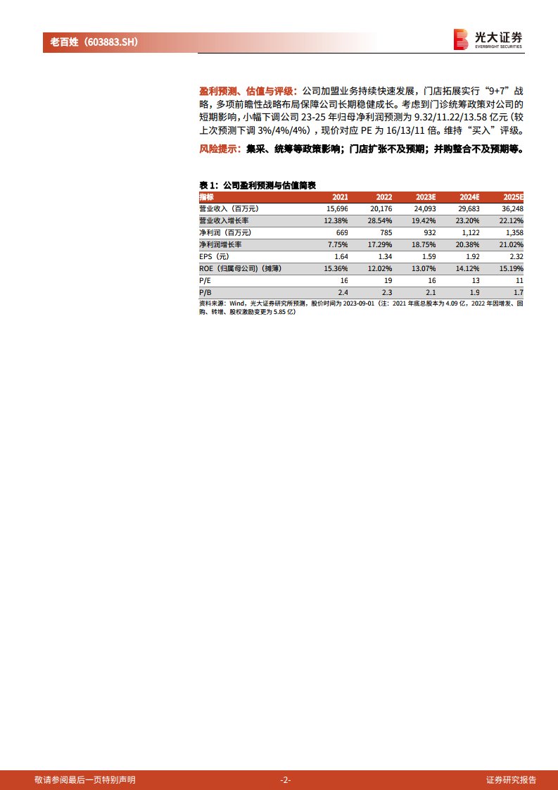 老百姓(603883.SH)2023年上半年业绩受医保门诊统筹政策影响,第二季度增速有所放缓,但公司通过“聚焦+下沉”的门店扩张策略、“加盟+联盟”的协同发展模式,以及新零售和供应链的数智化转型,展现出强大的市场适应能力和增长潜力。公司积极承接处方外流,持续提升慢病管理和会员服务能力,构建了稳固的客户基础和多元化的服务体系。尽管短期盈利预测有所下调,但其清晰的战略布局和持续的运营优化,为长期发展提供了坚实保障。光大证券维持“买入”评级,看好公司未来的稳健成长。
