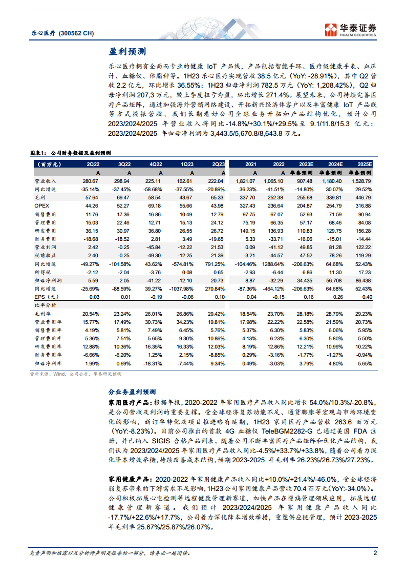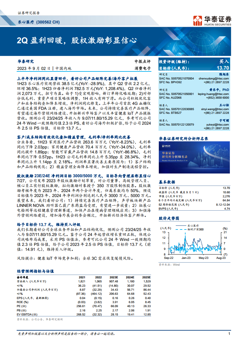 乐心医疗在2023年第二季度实现了显著的盈利回暖,上半年归母净利润同比大幅增长1,208.4%,主要得益于公司在客户和业务结构优化以及精益管理方面的努力。公司积极完善医疗产品矩阵,首款4G血糖仪已获美国FDA注册,并持续拓展远程健康管理新赛道。同时,公司通过股权激励计划设定了明确的业绩目标,彰显了管理层对未来增长的信心,并加速海外营销网络建设以拓展新兴市场。尽管面临健康IoT市场竞争加剧和全球3C需求恢复缓慢的风险,但华泰研究基于公司积极的全球化布局和产品结构优化,维持“买入”评级,并给予目标价13.7元,看好其长期发展潜力。