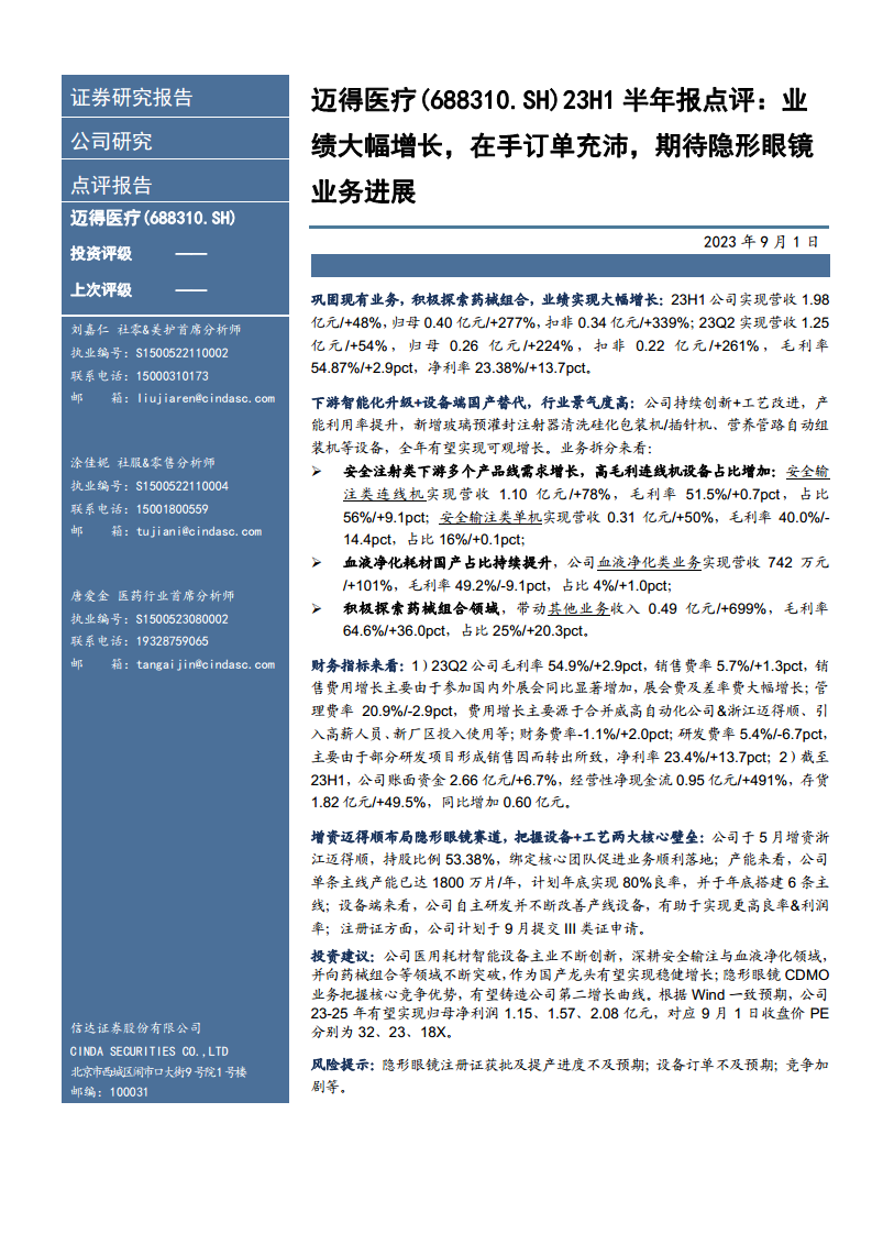 迈得医疗(688310)23H1半年报点评:业绩大幅增长,在手订单充沛,期待隐形眼镜业务进展