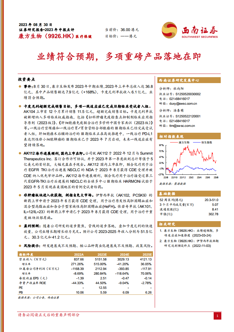 康方生物于2023年8月30日发布中期业绩报告。报告显示,2023年上半年公司总收入达到36.8亿元。其中,产品销售额实现显著增长,达到7.9亿元,同比增长168%。核心产品卡度尼利单抗贡献了6.1亿元的收入,整体业绩表现符合市场预期。