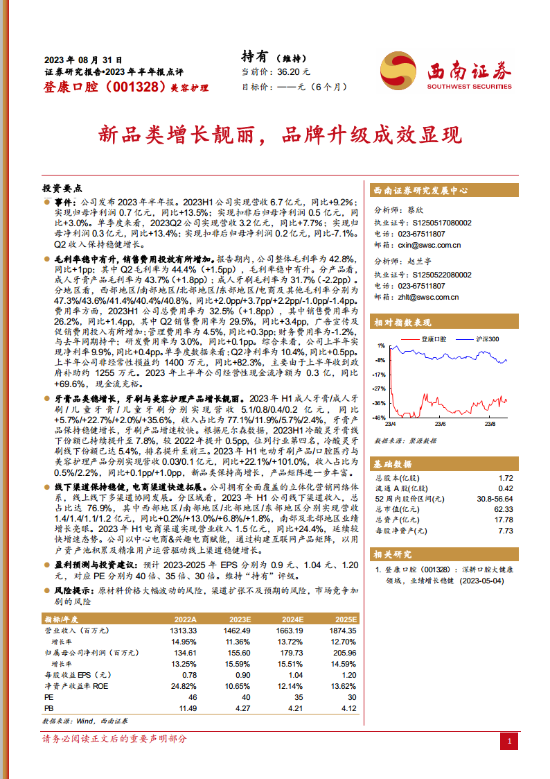 登康口腔在2023年上半年展现出强劲的经营韧性和增长潜力。公司营收和归母净利润均实现稳健增长,尤其在第二季度保持了良好势头。盈利能力方面,毛利率和净利率均有所提升,显示出公司在成本控制和效率提升方面的成效。产品结构持续优化,核心牙膏产品保持稳定增长,而电动牙刷、口腔医疗与美容护理等新兴品类则实现了高速增长,成为公司未来发展的重要驱动力。在渠道策略上,公司成功实现了线上线下协同发展,线下渠道在南部和北部地区表现突出,电商渠道则通过精细化运营实现了快速扩张。尽管面临原材料价格波动、渠道扩张不及预期以及市场竞争加剧等风险,但公司通过持续的产品创新、品牌升级和渠道优化,有望在口腔大健康领域保持领先地位并实现可持续发展。西南证券维持“持有”评级,反映了对公司未来业绩增长的肯定以及对潜在风险的审慎考量。