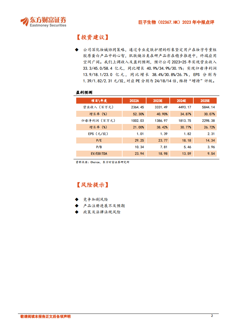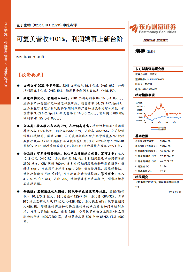巨子生物在2023年上半年展现出强劲的增长势头,得益于其核心品牌可复美的卓越表现、功效性护肤品的市场主导地位以及成功的渠道策略转型。公司在营销和研发上的战略性投入,特别是对直销渠道的深耕和对重组胶原蛋白产品线的持续创新,为其未来的可持续发展奠定了坚实基础。尽管毛利率和净利率因战略性投入有所波动,但整体盈利能力依然强劲。展望未来,公司深厚的研发管线和在医美领域的协同策略预示着广阔的市场空间。分析师上调了公司2023-2025年的收入和盈利预测,并维持“增持”评级,但同时提示了市场竞争加剧、产品注册进展不及预期及政策法规变化等潜在风险。