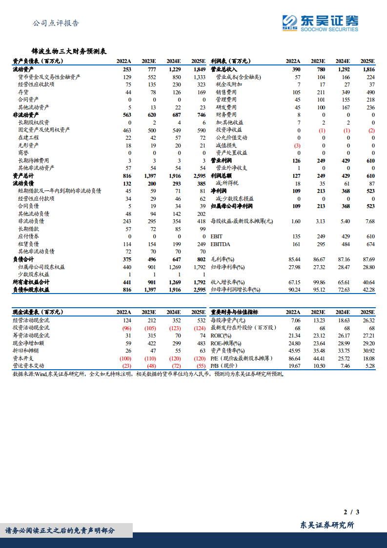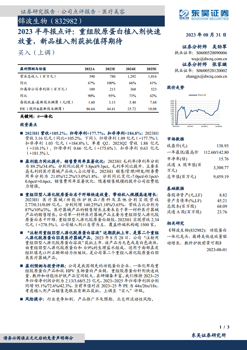 报告维持了对锦波生物2023年至2025年的盈利预测,预计归母净利润分别为2.13亿元、3.68亿元和5.23亿元。对应2023年至2025年归母净利润的同比增长率分别为95.1%、72.6%和42.3%。当前市值对应2023年至2025年的市盈率(PE)分别为44倍、26倍和18倍。 鉴于公司植入剂产品销售表现亮眼且有新品获批,报告将锦波生物的投资评级上调至“买入”。同时,报告提示了行业竞争加剧、产品推广不及预期以及北交所流动性风险等潜在风险。