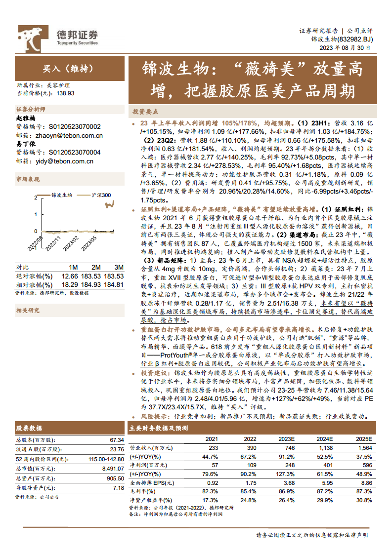 锦波生物在2023年上半年展现出卓越的财务表现,营收和归母净利润分别实现105%和178%的同比高速增长,远超市场预期。这一显著增长主要得益于其核心产品“薇旖美”重组胶原蛋白冻干纤维的强劲放量,以及公司在医疗器械领域的持续高景气度。报告强调,锦波生物凭借其在重组胶原蛋白领域的领先技术和稀缺的证照优势,成功构建了坚固的市场壁垒,并正通过深化渠道布局和丰富产品矩阵,进一步巩固其在医美市场的领导地位。