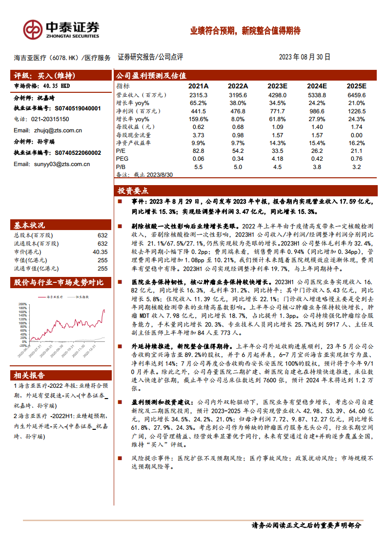 海吉亚医疗2023年上半年业绩表现稳健,核心肿瘤业务持续快速增长,展现出强大的内生增长动力。同时,公司积极推进外延并购战略,成功整合新收购医院并实现盈利,并通过自建和扩建加速床位规模扩张。在内外双轮驱动下,公司未来业绩增长确定性高,作为肿瘤医疗服务领域的龙头企业,其长期发展前景值得期待。分析师维持“买入”评级,但投资者仍需关注潜在的扩张、运营及政策风险。