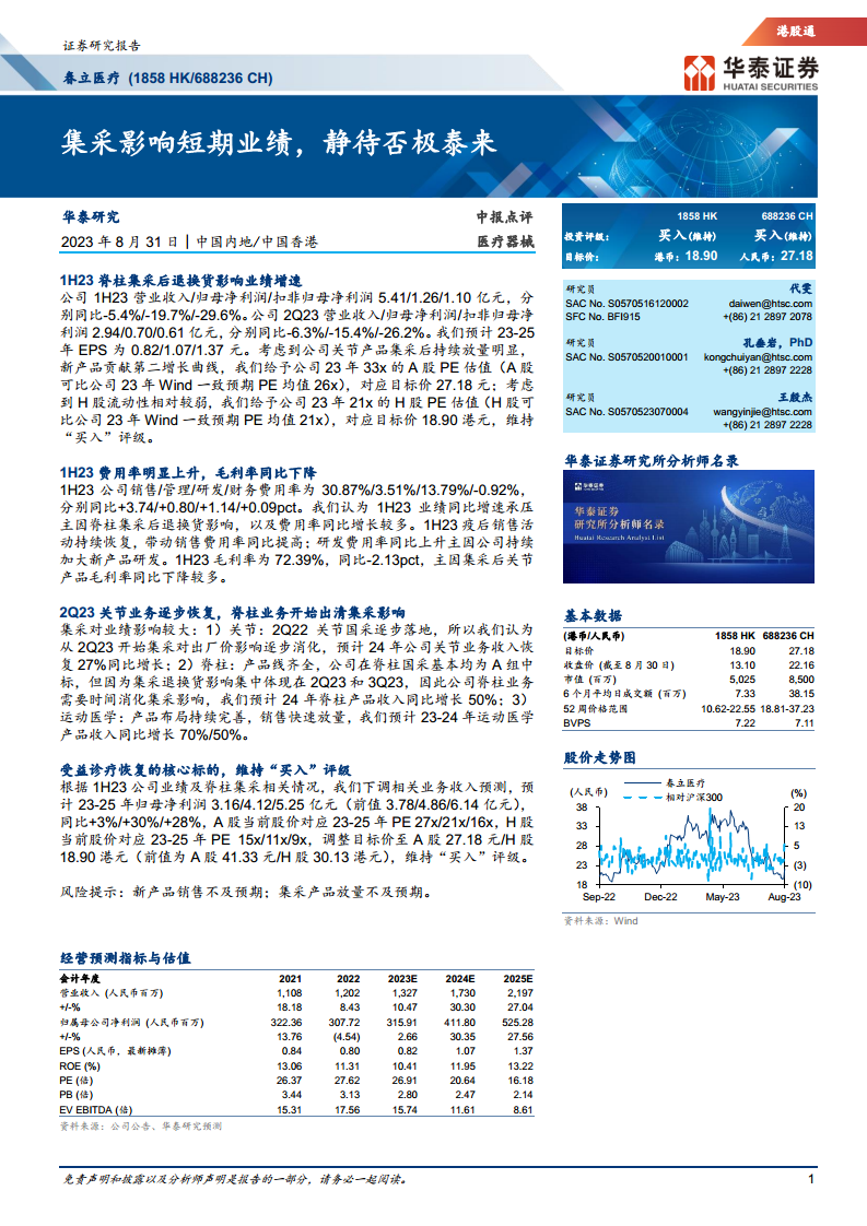 基于对1H23业绩和集采影响的最新评估,华泰研究对春立医疗的盈利预测进行了调整,并重申了“买入”评级。