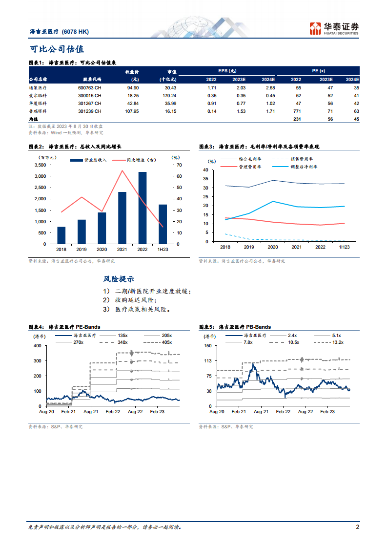 在外延扩张方面,新收购医院预计将为公司带来显著的利润增量。宜兴海吉亚在2023年7月创下月收入历史新高,净利率提升至14%,预计年内将贡献逾1000万元的并表利润。西安长安医院在并表后,预计2023/2024年收入将分别实现10%/20%的同比增长。通过公司在肿瘤学科建设、经营效率提升和成本费用控制方面的赋能,预计西安长安医院在2023年末的单月利润率有望冲击15%。假设其在2023年10月并表,预计将为公司2023/2024年分别增厚约1300万元/超1亿元的净利润。这些新收购医院的快速整合和盈利能力提升,将成为公司未来业绩增长的重要驱动力。
