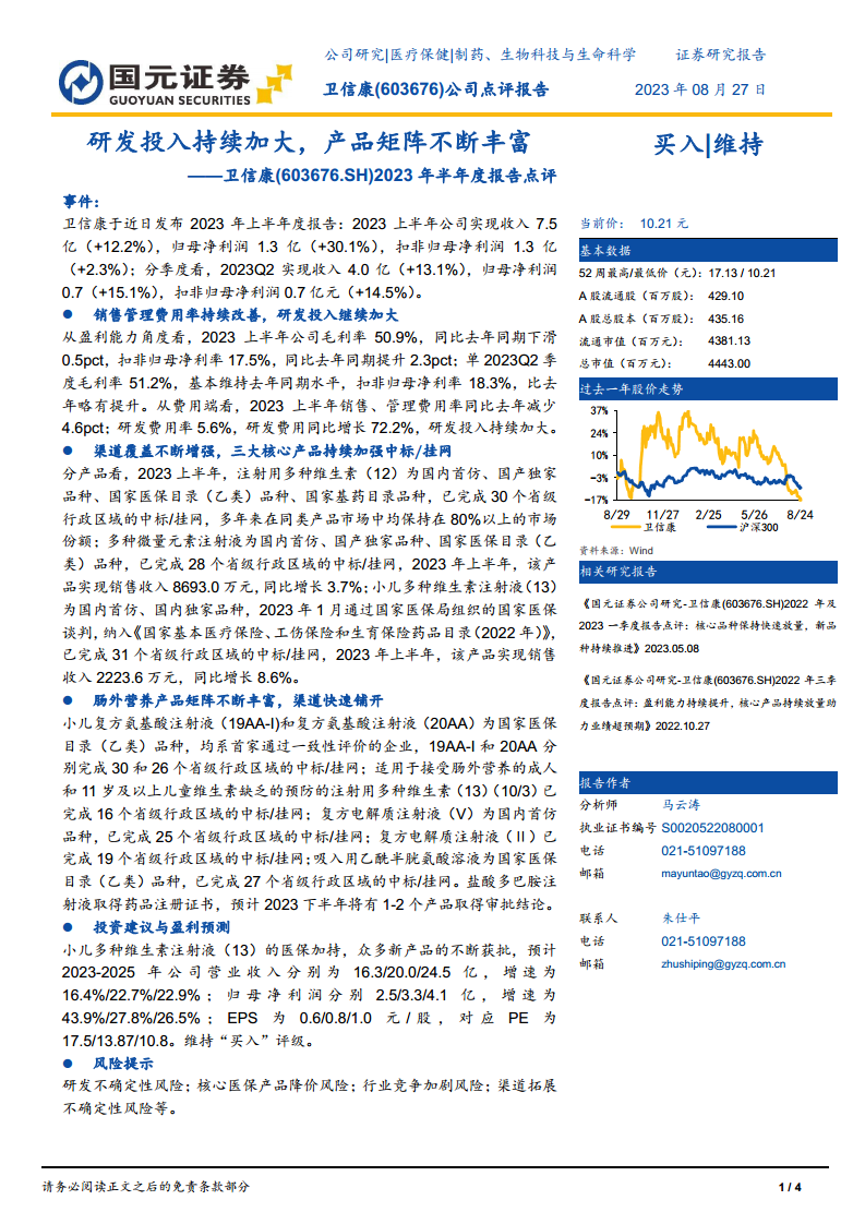 卫信康在2023年上半年展现出稳健的经营态势,营收和归母净利润实现双位数增长,尤其归母净利润增速显著。公司通过优化销售管理费用、加大研发投入,持续提升盈利能力。在产品策略上,核心产品市场份额保持领先,并通过医保目录的纳入和广泛的渠道覆盖,进一步巩固了市场地位。同时,公司积极拓展肠外营养产品线,多款新产品获批或正在审批中,为未来业绩增长储备了动力。基于此,分析师对公司未来业绩持乐观态度,并维持“买入”评级,但同时提示了研发、医保降价、市场竞争和渠道拓展等潜在风险。