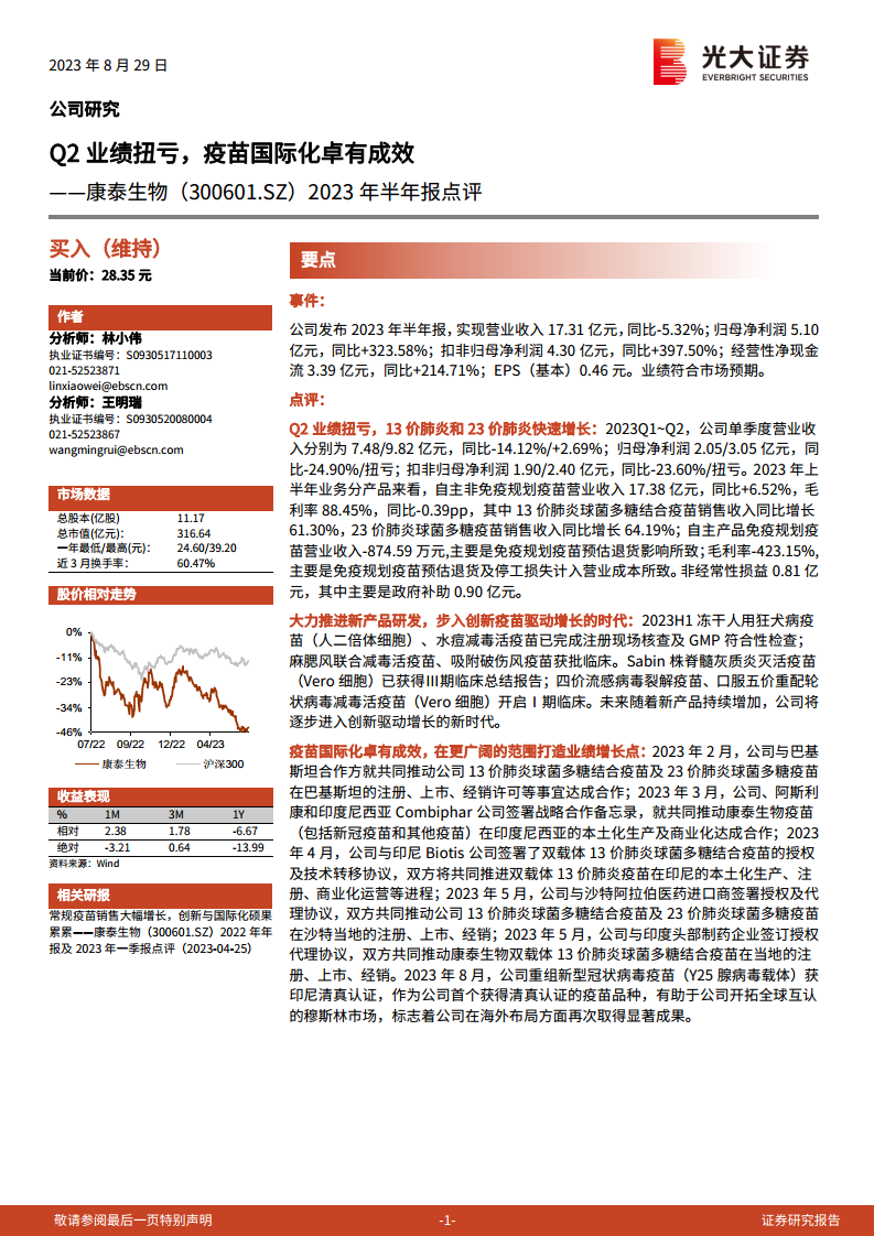 康泰生物(300601)2023年半年报点评:Q2业绩扭亏,疫苗国际化卓有成效