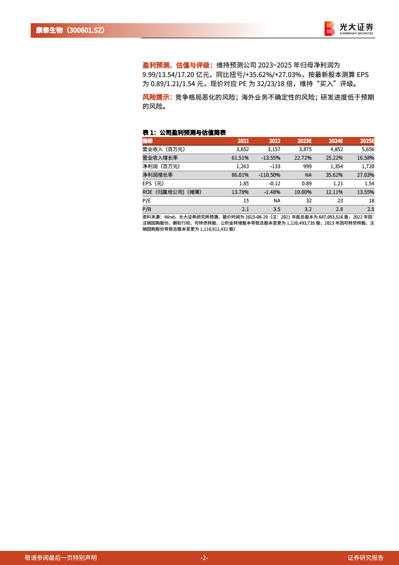 分析师维持对康泰生物的“买入”评级。预计公司2023年至2025年归母净利润分别为9.99亿元、13.54亿元和17.20亿元,同比分别实现扭亏、增长35.62%和27.03%。按最新股本测算,对应每股收益(EPS)分别为0.89元、1.21元和1.54元。当前股价对应的市盈率(PE)分别为32倍、23倍和18倍。报告同时提示了竞争格局恶化、海外业务不确定性以及研发进度低于预期的风险。