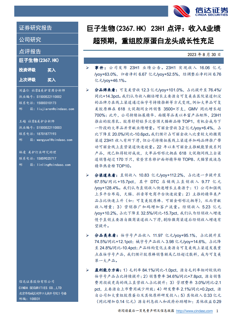 巨子生物(02367)23H1点评:收入、业绩超预期,重组胶原蛋白龙头成长性充足