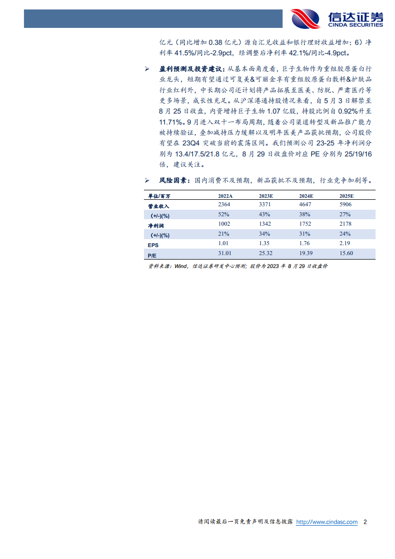从沪深港通持股情况来看,自5月3日解禁至8月25日收盘,内资增持巨子生物1.07亿股,持股比例从0.92%上升至11.71%,显示市场对公司未来发展的信心增强。随着9月进入双十一布局周期,公司渠道转型和新品推广能力持续得到验证,叠加减持压力缓解以及明年医美产品获批的预期,公司股价有望在23Q4突破当前的震荡区间。信达证券预测公司2023-2025年净利润分别为13.4亿元、17.5亿元和21.8亿元,对应8月29日收盘价的PE分别为25倍、19倍和16倍,维持“买入”评级,建议关注。