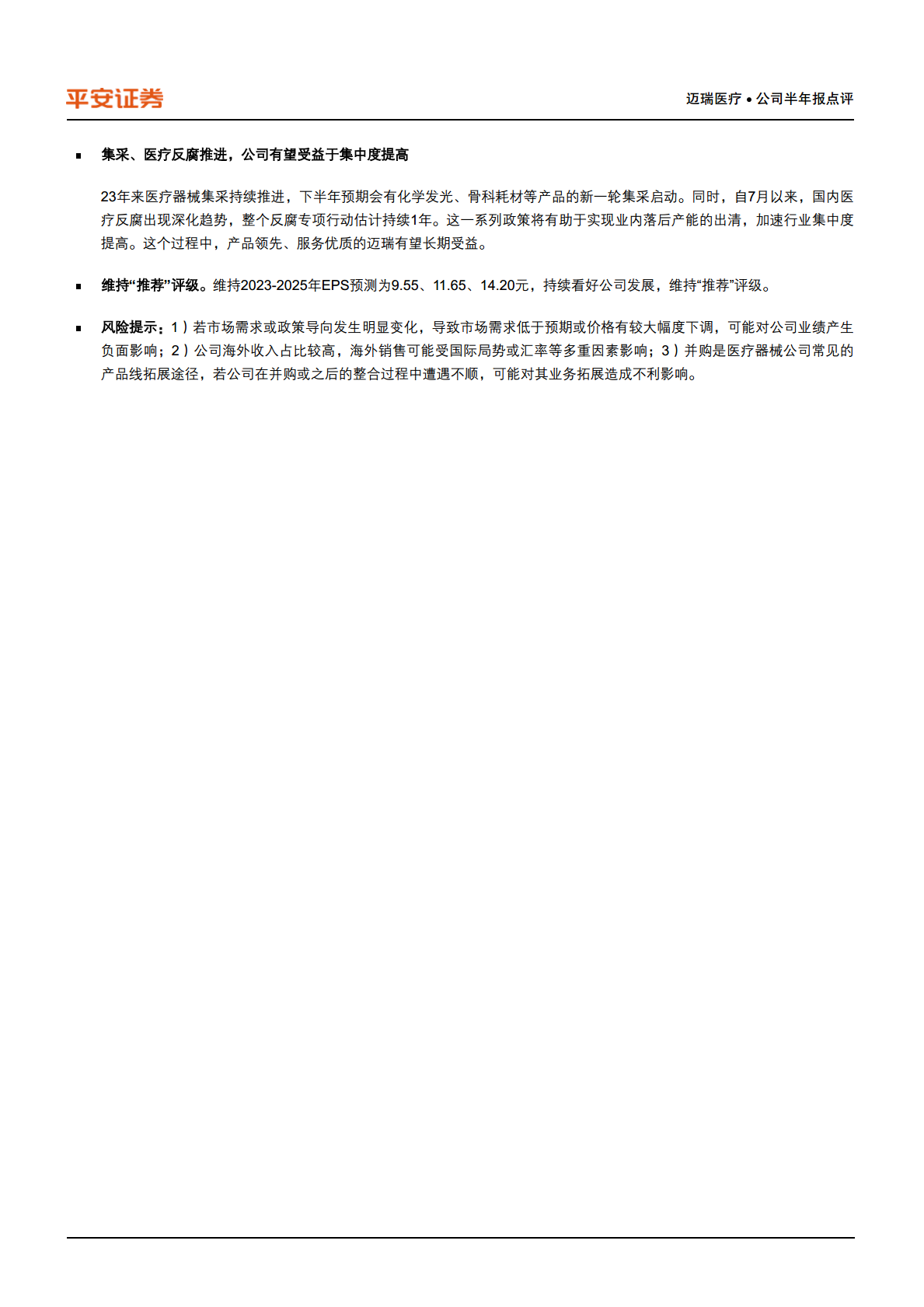 迈瑞医疗在2023年上半年实现了营收和净利润的稳健增长,这主要得益于国内常规诊疗的恢复、产品结构的优化以及毛利率的提升。公司持续推进其全球化战略,在海外高端市场取得突破,并通过战略并购加速IVD业务的国际化布局。展望未来,国内医疗器械集采和医疗反腐政策将加速行业集中度提高,迈瑞医疗凭借其强大的产品竞争力和服务优势,有望在此过程中进一步巩固市场地位并实现长期发展。报告维持“推荐”评级,但同时提示了市场需求、海外业务和并购整合等方面的潜在风险。