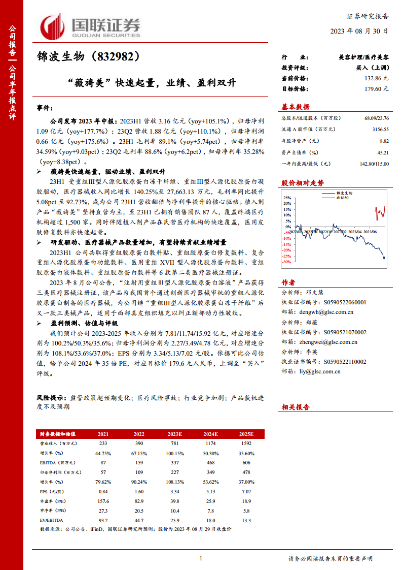 锦波生物在2023年上半年展现出卓越的经营业绩和盈利能力,营收和归母净利润均实现翻倍增长,毛利率和净利率显著提升。这一强劲表现主要得益于核心产品“薇旖美”在医疗器械市场的快速放量和直营模式的有效推广。同时,公司在研发方面的持续投入取得了丰硕成果,多款二类医疗器械的获批以及首个创新三类械“注射用重组Ⅲ型人源化胶原蛋白溶液”的成功注册,进一步巩固了其在重组胶原蛋白领域的领先地位,并为未来的业绩增长提供了坚实保障。鉴于公司强大的产品创新能力和市场扩张潜力,分析师上调其投资评级至“买入”,并对其未来几年的业绩增长持乐观预期。投资者在关注公司发展潜力的同时,也需留意报告中提及的各项风险因素。