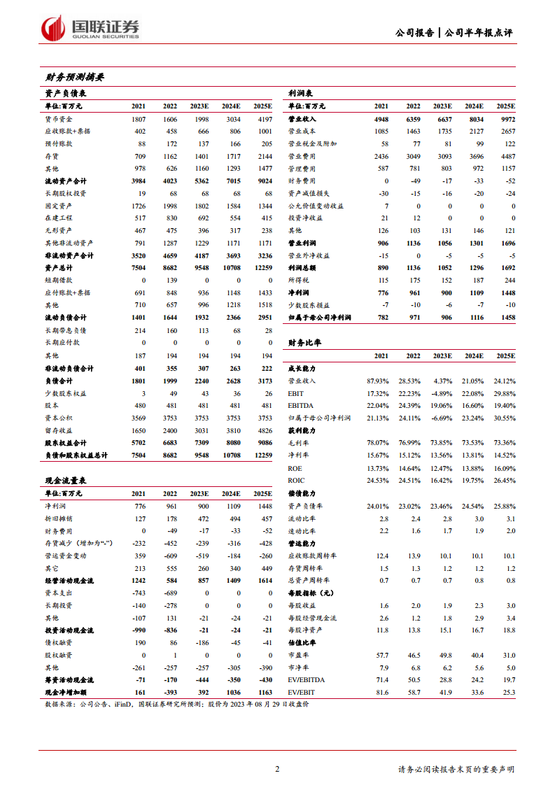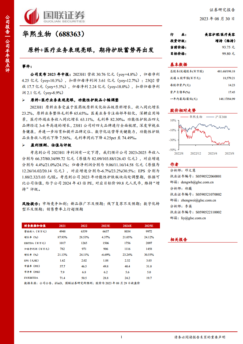 华熙生物2023年上半年业绩呈现结构性特点,原料业务和医疗终端业务表现强劲,分别实现23.2%和63.11%的收入增长,并保持高毛利率。然而,作为公司重要增长引擎的功能性护肤品业务,在经历高速发展后进入战略调整期,导致收入同比下降7.56%,并对整体盈利能力造成短期压力,归母净利润同比下降10.3%。尽管分析师下调了未来三年的盈利预测,但考虑到公司在核心业务领域的竞争优势以及对功能性护肤品业务的积极调整和能力提升,市场对其长期发展潜力仍持乐观态度。因此,分析师维持“增持”评级,并设定了99.8元的目标价,表明对公司未来通过业务优化和战略调整实现可持续增长的信心。同时,报告也提示了市场竞争、新品推广、线下复苏、数字化转型及销售费率等潜在风险。