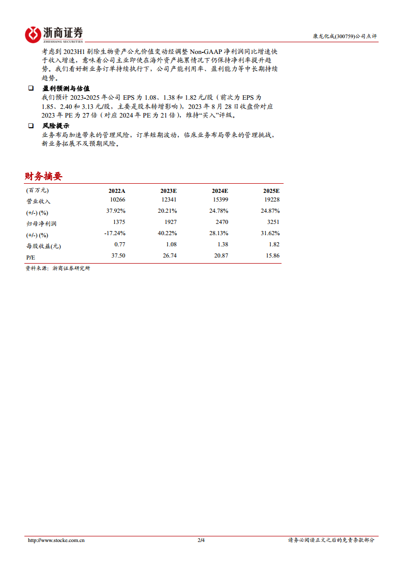 基于2023年8月28日收盘价,公司2023年市盈率(PE)为27倍(对应2024年PE为21倍)。报告维持对康龙化成的“买入”投资评级。