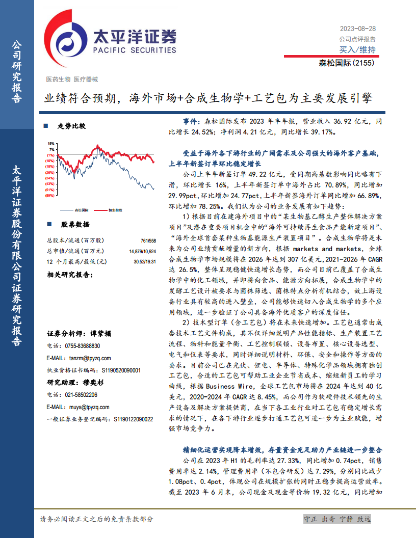 公司上半年新签订单中海外占比高达70.89%,同比和环比均大幅提升,显示出海外市场的强劲需求和公司强大的客户基础。同时,公司积极布局合成生物学和工艺包等高技术壁垒领域,预计将为未来业绩贡献新的增量。通过精细化运营,公司实现了毛利率提升和费用率下降,财务状况稳健,为未来的产业链整合和业务扩张奠定了基础。