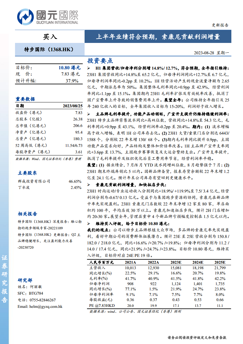特步国际(01368):上半年业绩符合预期,索康尼贡献利润增量
