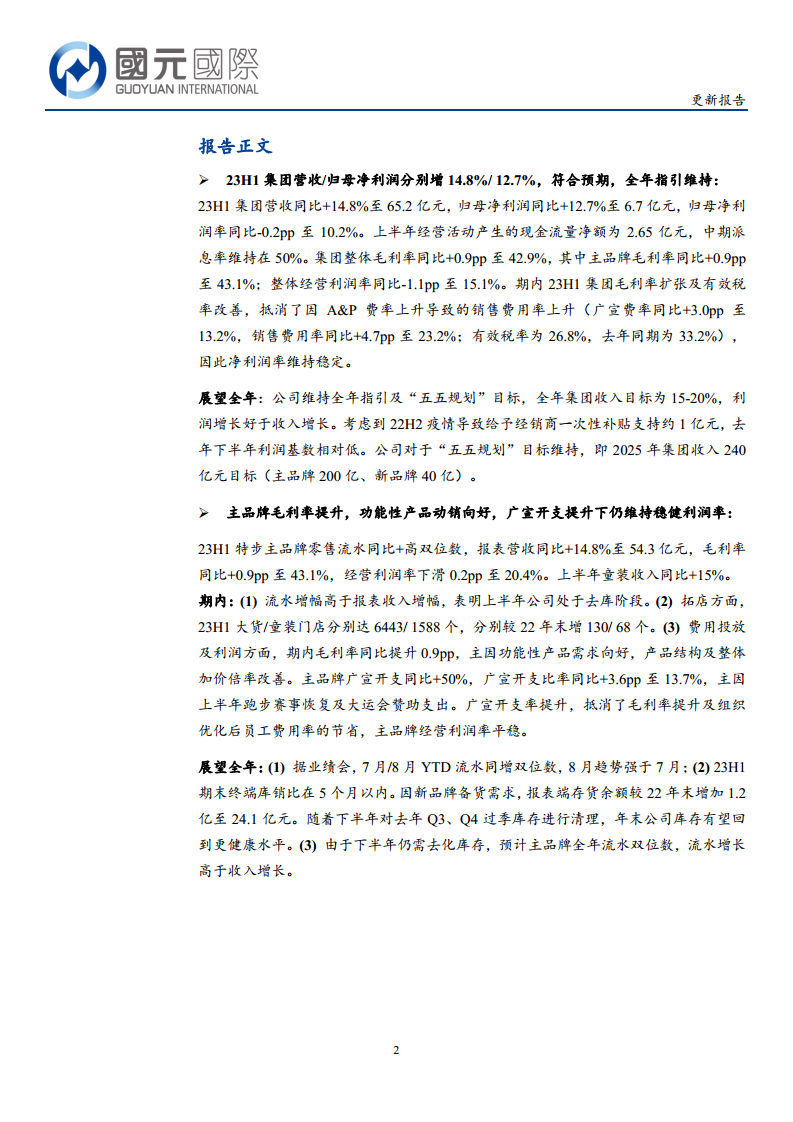 特步国际在2023年上半年展现出强劲的财务韧性与增长潜力。集团营收同比增长14.8%至65.2亿元人民币,归母净利润同比增长12.7%至6.7亿元人民币,均符合市场预期。这一稳健表现主要得益于特步主品牌在功能性产品领域的持续发力,带动毛利率提升0.9个百分点至43.1%,以及多品牌战略的初步成功,特别是索康尼品牌率先实现盈利,贡献了利润增量。尽管营销及广宣费用有所增加,但公司通过有效的成本控制和税率优化,成功维持了整体净利润率的稳定,凸显了其在复杂市场环境下的经营效率。