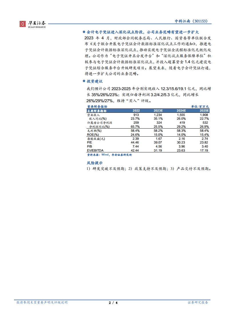 华安证券预计中科江南2023-2025年分别实现收入12.3亿元、15.6亿元和19.1亿元,同比增速分别为35%、26%和23%。同期归母净利润预计分别为3.2亿元、4.2亿元和5.3亿元,同比增速分别为26%、29%和27%。基于公司强劲的业绩增长和新兴业务的广阔前景,华安证券维持“买入”评级。