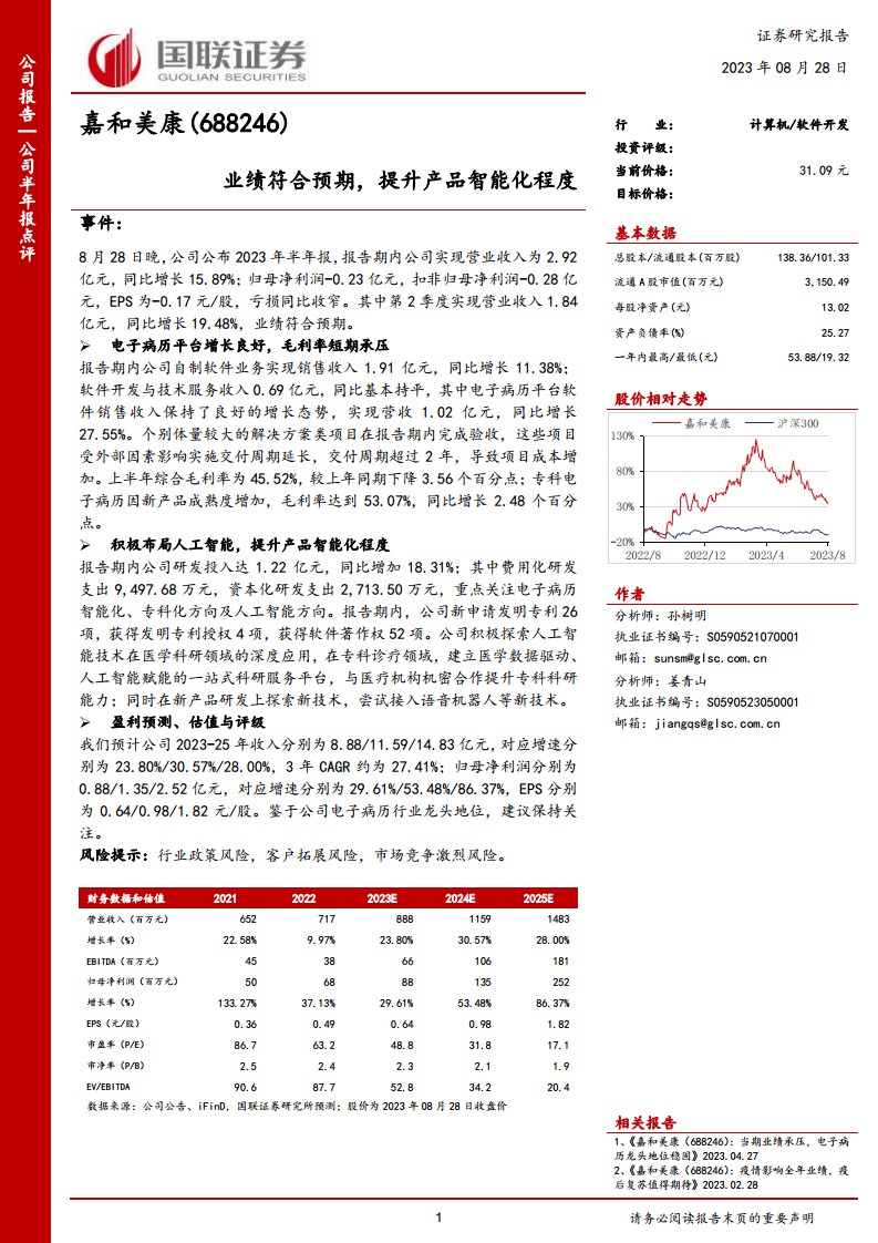 嘉和美康2023年上半年业绩符合预期,营业收入实现稳健增长,亏损同比收窄。公司核心的电子病历平台业务保持良好增长态势,尤其专科电子病历毛利率有所提升。面对部分大型项目交付周期延长带来的毛利率短期压力,公司通过加大研发投入,积极布局人工智能和电子病历智能化、专科化,以期提升产品竞争力。未来,随着AI技术的深入应用和新产品的成熟,公司有望进一步巩固其市场地位并实现盈利能力的持续改善。