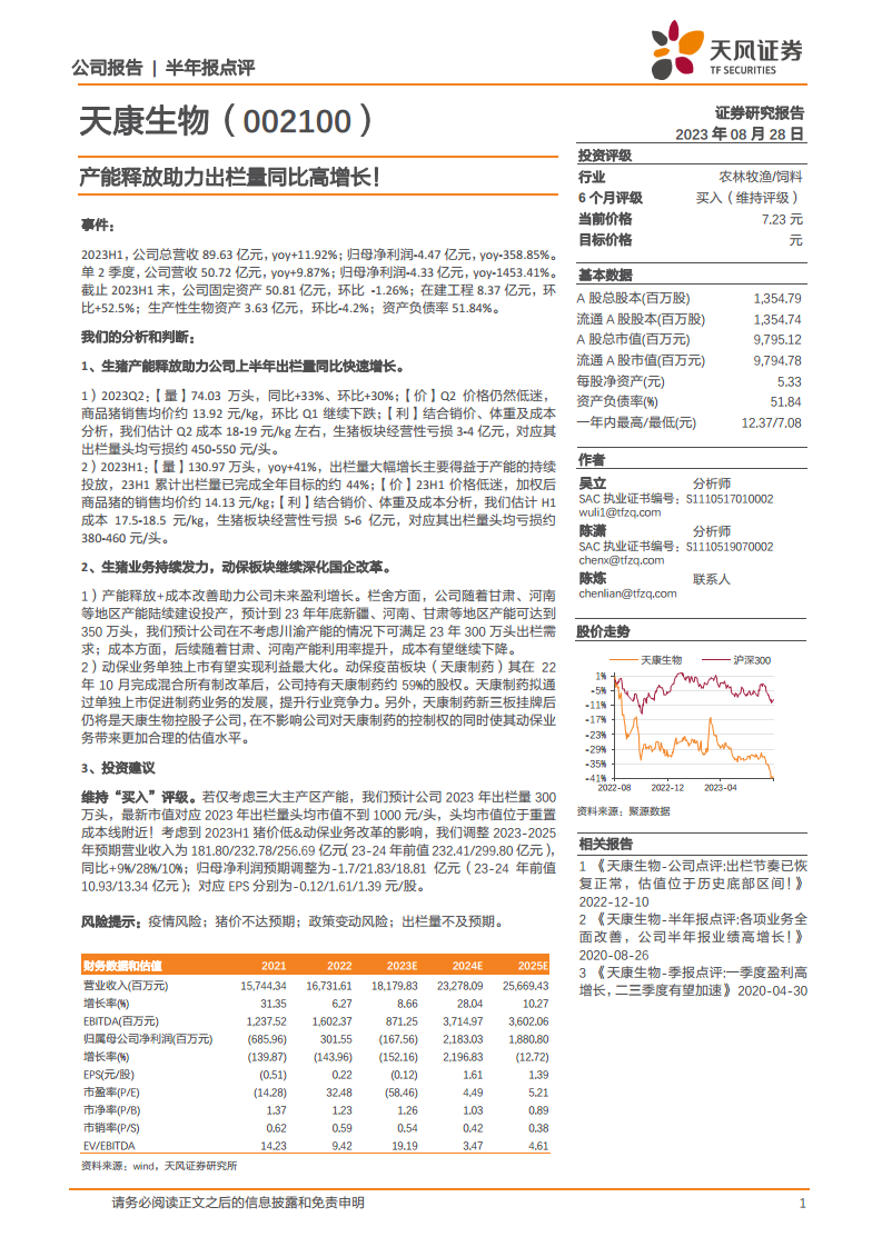 天康生物2023年上半年营收实现增长,但受猪价持续低迷影响,归母净利润出现显著亏损。尽管面临短期业绩压力,公司生猪出栏量同比大幅增长,显示出产能释放的积极成效。公司正通过持续的产能建设和利用率提升,致力于改善生猪养殖成本。同时,动保业务通过混合所有制改革并拟独立上市,旨在提升其市场竞争力和估值。分析师维持“买入”评级,认为公司当前估值具有吸引力,并调整了未来三年的业绩预期,反映了短期挑战与长期盈利改善的潜力,但需关注疫情、猪价波动、政策变动及出栏量等潜在风险。