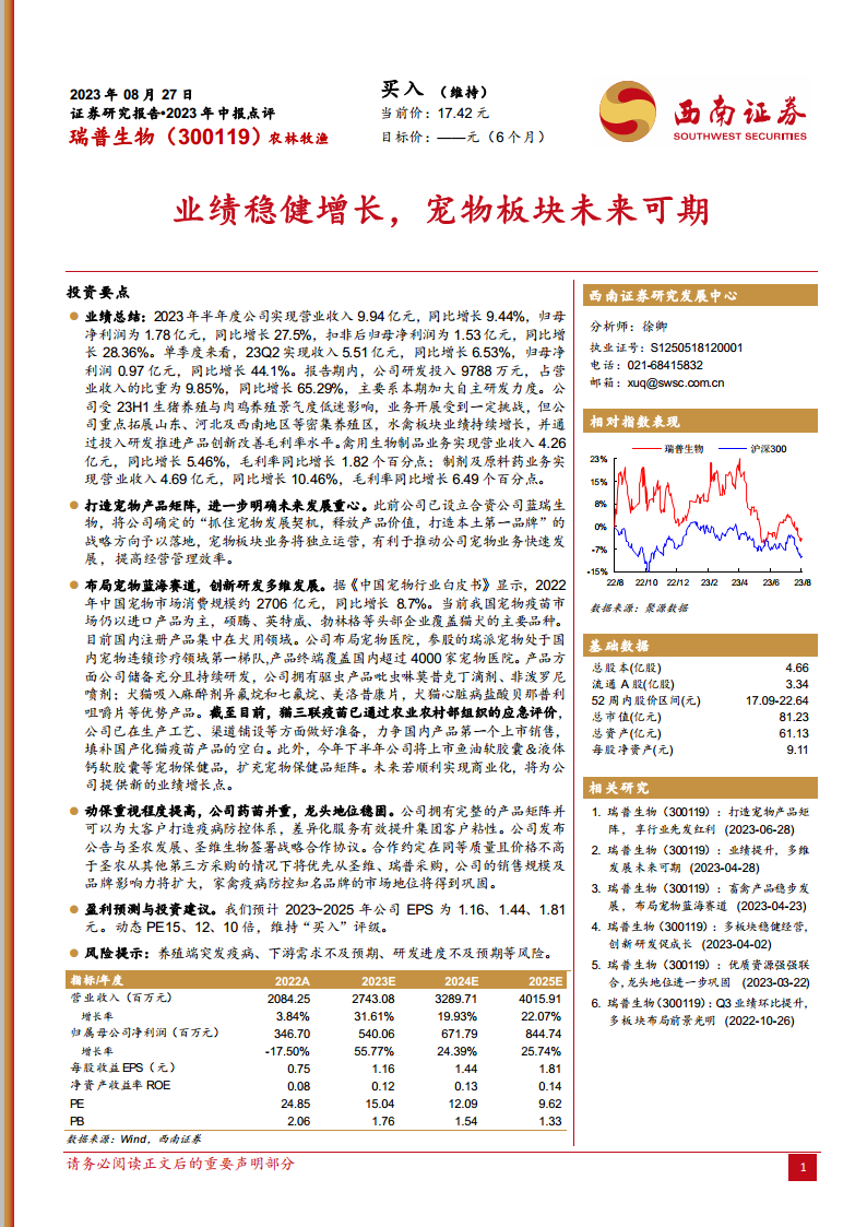 瑞普生物在2023年上半年展现出稳健的财务增长,营业收入和归母净利润均实现显著提升。尽管面临生猪和肉鸡养殖景气度低迷的外部挑战,公司通过区域拓展、产品创新及毛利率改善,有效对冲了不利影响。同时,公司明确将宠物板块作为未来发展的核心驱动力,通过设立合资公司、布局蓝海赛道及持续研发,积极构建宠物产品矩阵,以期抓住宠物经济的增长机遇。