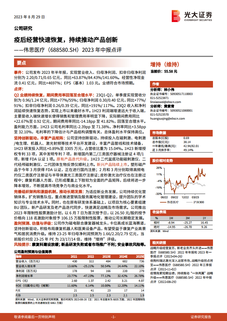 伟思医疗在2023年上半年实现了卓越的经营业绩,营收和净利润均实现高速增长,经营性现金流大幅改善,充分展现了公司在后疫情时代的强劲复苏势头和市场竞争力。公司通过持续的研发投入和产品创新,不仅成功迭代升级了现有核心产品,更积极拓展了康复机器人和医美设备等新兴高成长领域,有效丰富了产品矩阵和技术储备。此外,公司通过优化组织架构和实施股权激励计划,进一步完善了内部管理和长期发展机制,为未来的可持续增长奠定了坚实基础。鉴于伟思医疗在康复器械领域的领先地位、创新驱动的战略以及对高成长赛道的积极拓展,预计公司未来业绩将持续保持增长态势,因此维持“增持”评级。