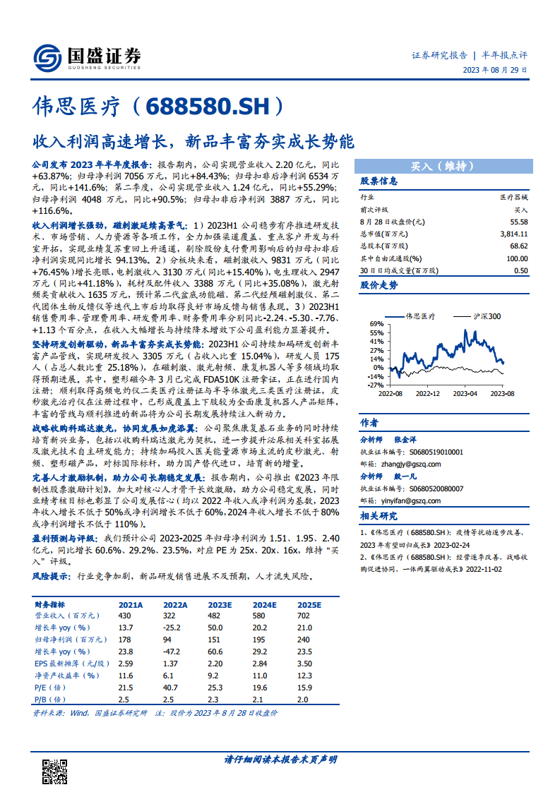 伟思医疗在2023年上半年展现出强劲的增长势头,营业收入和归母净利润均实现高速增长,特别是磁刺激业务表现突出。公司通过持续的研发投入和新产品注册,不断丰富产品管线,为未来发展奠定基础。战略收购科瑞达激光进一步拓展了业务边界,布局医美能量源市场。同时,推出的限制性股票激励计划彰显了公司对未来业绩增长的信心。分析师预计公司未来三年将保持稳健增长,并维持“买入”评级,但需关注行业竞争、新品进展及人才流失等潜在风险。