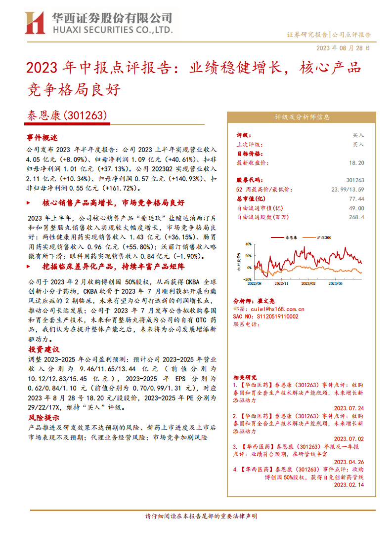 泰恩康(301263)2023年中报点评报告:业绩稳健增长,核心产品竞争格局良好