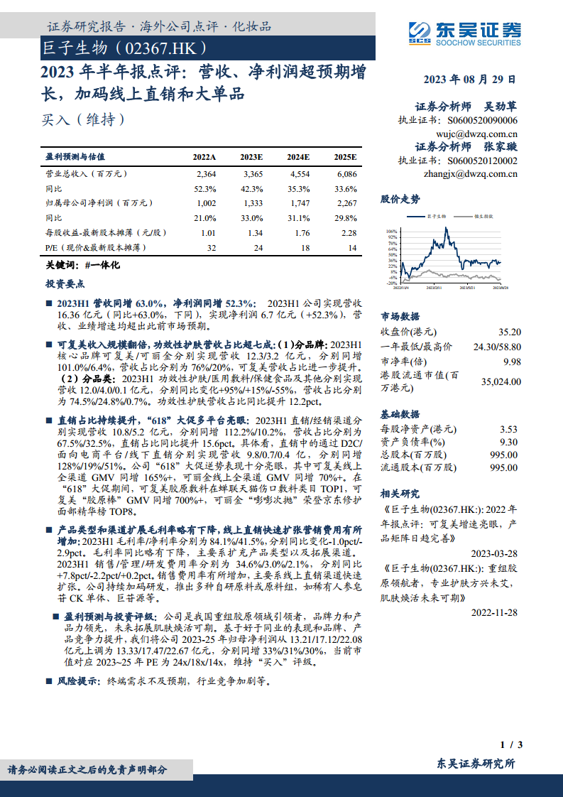 巨子生物在2023年上半年取得了超出市场预期的优异业绩,营收和净利润均实现高速增长。核心品牌可复美和功效性护肤品类的强劲表现,以及线上直销渠道的成功拓展,是驱动公司业绩增长的关键因素。尽管毛利率因战略性投入略有波动,但公司整体盈利能力保持健康,并通过持续的研发投入巩固了其在重组胶原领域的领先地位。鉴于公司强大的品牌力、产品竞争力以及清晰的增长路径,分析师上调了其未来三年的盈利预测,将2023-2025年归母净利润分别上调至13.33亿元、17.47亿元和22.67亿元,并维持“买入”评级,认为巨子生物作为重组胶原领域的引领者,未来在肌肤焕活市场仍具备广阔的增长空间。投资者需关注终端需求不及预期和行业竞争加剧等潜在风险。