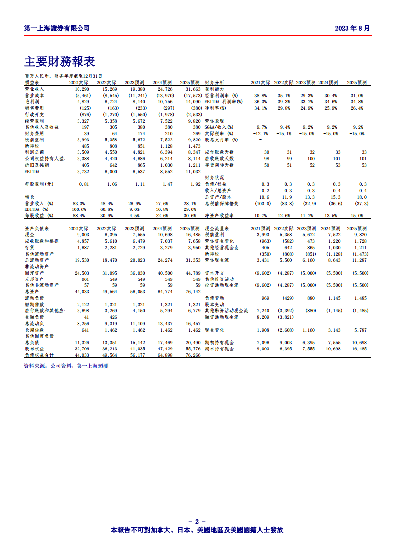 从盈利摘要和财务报表预测来看,公司预计在2023年至2025年间保持稳健的收入增长,分别为26.9%、27.6%和28.1%。净利润预计在2023年增长6.0%后,于2024年和2025年分别实现32.6%和30.6%的高速增长,净利润率也将从2023年的24.9%逐步回升至2025年的26.4%。这表明市场预期公司在经历短期调整后,盈利能力将恢复并持续提升。在现金流方面,上半年资本开支为24亿元人民币,经营性现金流为27亿元人民币,自由现金流为3亿元人民币,显示公司在扩张的同时仍能保持正向的现金流管理。
