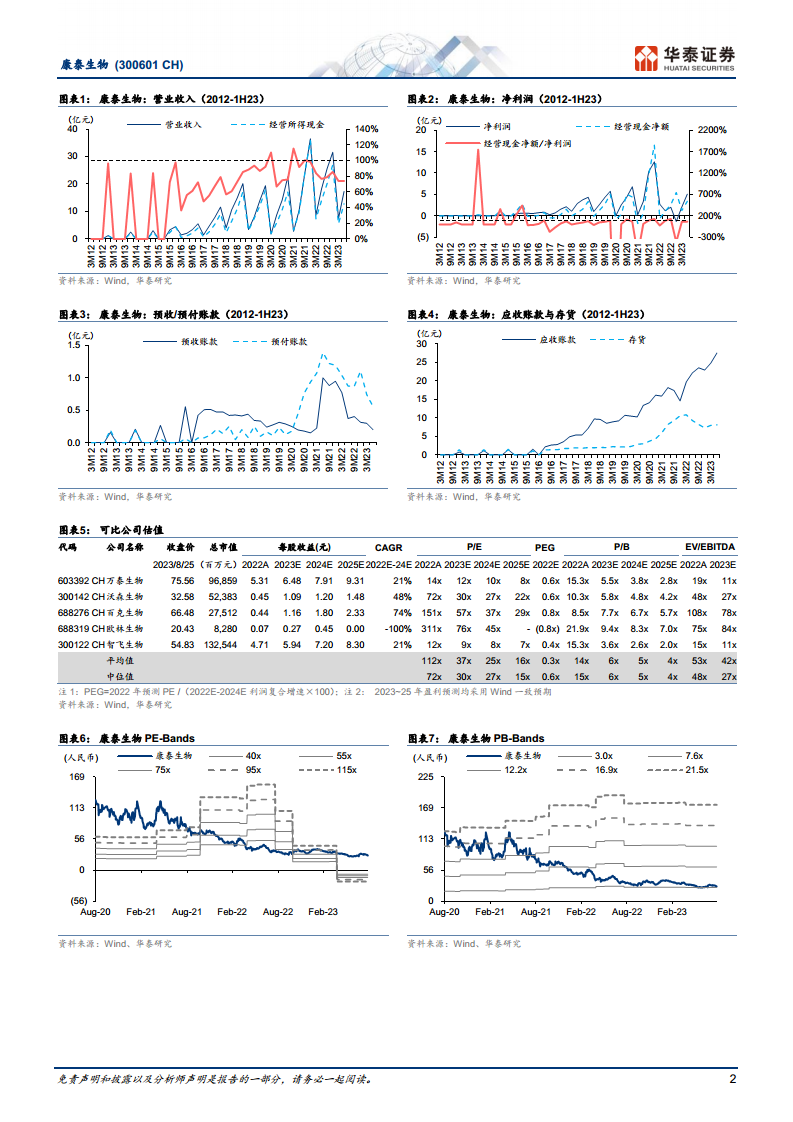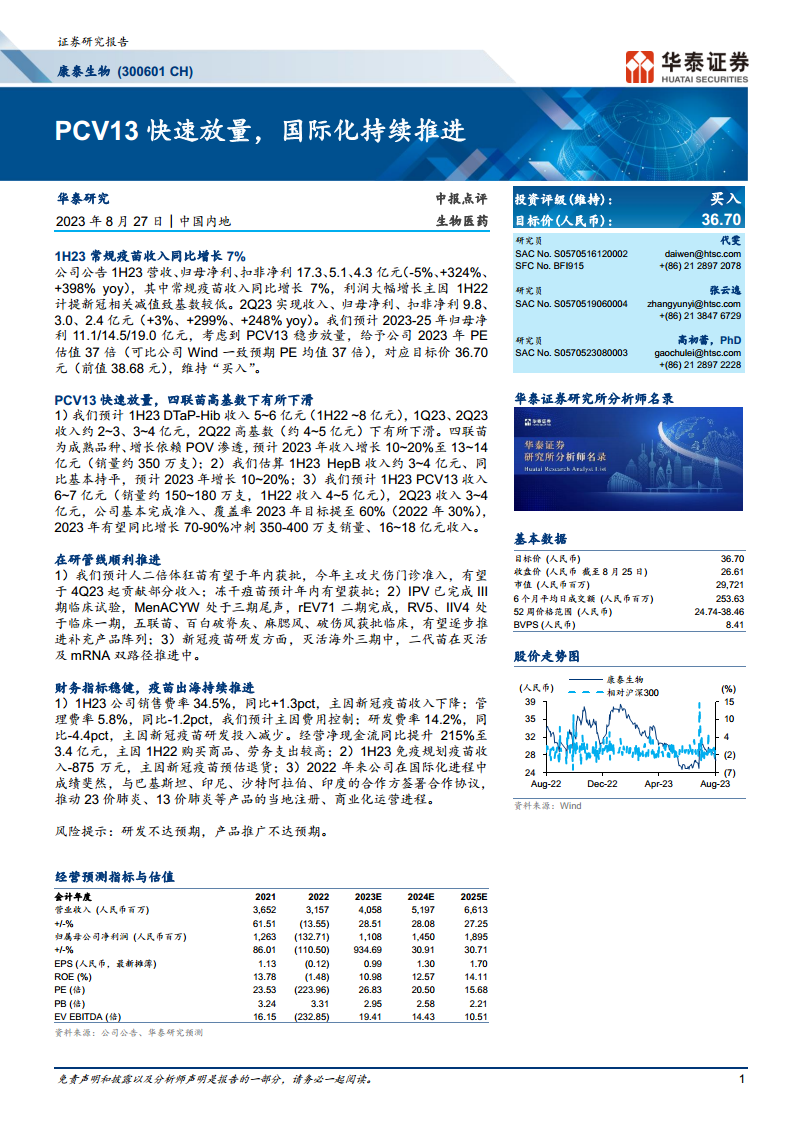 华泰研究预计康泰生物2023-2025年归母净利润分别为11.1亿元、14.5亿元和19.0亿元。考虑到PCV13的稳步放量,华泰研究维持公司“买入”投资评级,并给予2023年PE估值37倍(可比公司Wind一致预期PE均值37倍),对应目标价36.70元(前值38.68元)。