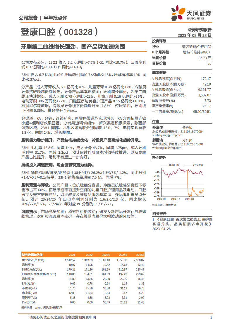 基于公司强劲的牙刷业务增长、市场份额的持续提升以及多品牌战略的有效推进,分析师预计登康口腔2023年、2024年和2025年归母净利润将分别达到1.6亿元、2.0亿元和2.3亿元,同比增长20%、22%和16%。对应的市盈率(PE)分别为39倍、31倍和27倍。鉴于公司良好的发展前景和增长潜力,报告维持对其“增持”的投资评级。