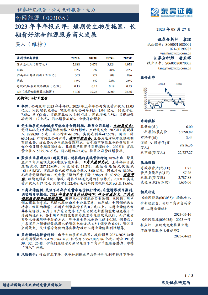 2023年半年报点评:短期受生物质拖累,长期看好综合能源服务商大发展