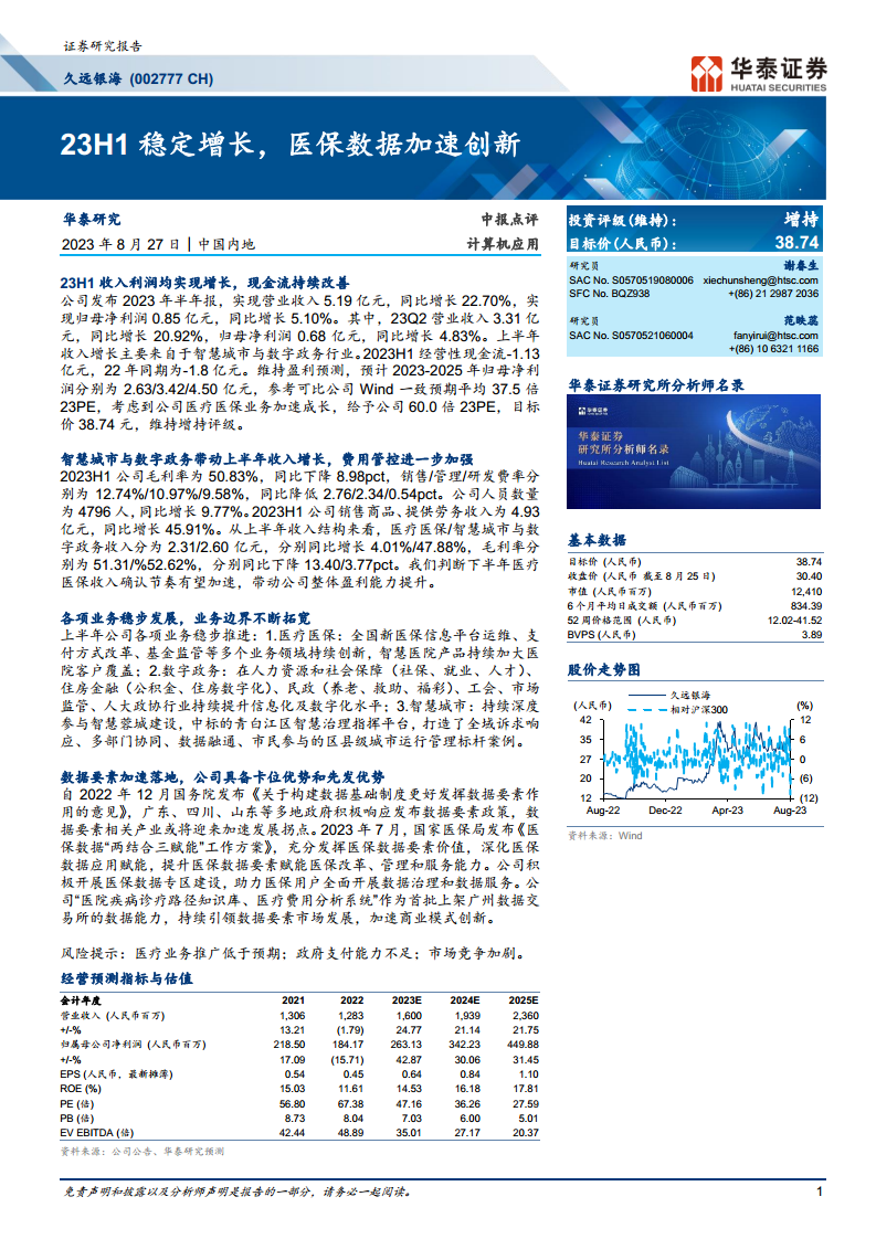 久远银海2023年上半年业绩实现稳定增长,营业收入和归母净利润均有所提升,其中智慧城市与数字政务业务是主要增长引擎。公司在费用管控方面取得积极进展,经营性现金流状况持续改善。各项业务稳步发展,特别是在医疗医保领域持续创新,并在数字政务和智慧城市建设中不断拓展业务边界。随着国家数据要素政策的深入推进,久远银海凭借其在医保数据领域的先发优势和技术积累,有望抓住市场机遇,加速商业模式创新并提升盈利能力。华泰研究维持其“增持”评级,并看好其未来发展潜力,但同时也提示了相关业务推广、政府支付能力及市场竞争等风险。