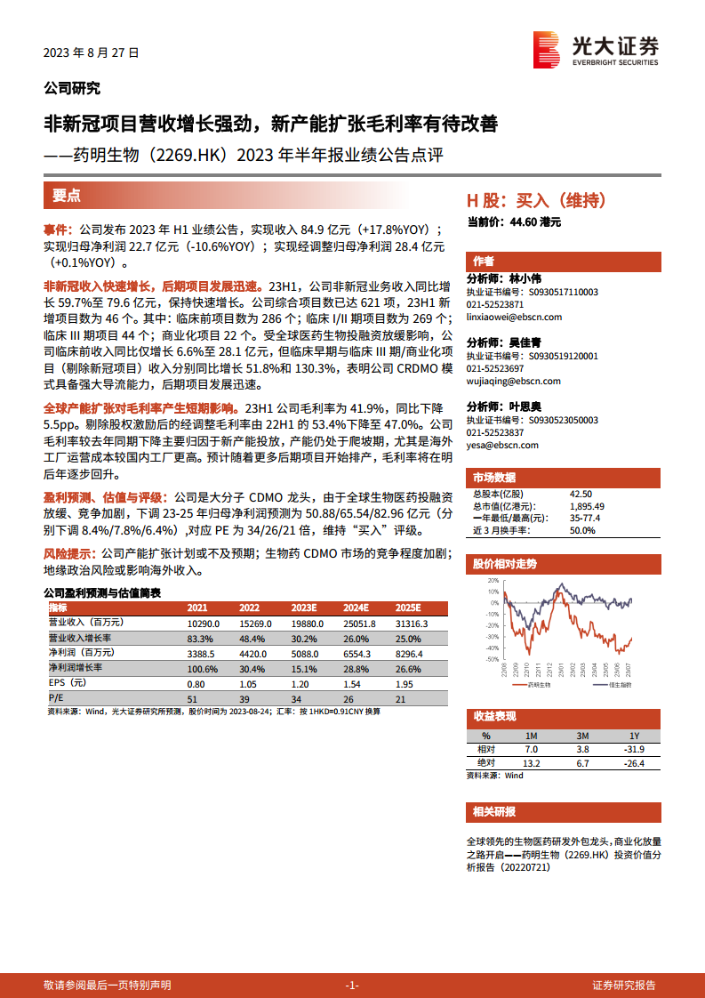 药明生物2023年上半年业绩显示,非新冠业务收入实现强劲增长,项目管线持续丰富,CRDMO模式在后期项目导流方面表现突出。然而,全球产能的持续扩张导致毛利率短期承压,主要原因在于新工厂处于产能爬坡期以及海外运营成本较高。尽管分析师下调了盈利预测,但公司作为大分子CDMO领域的龙头地位稳固,预计随着产能利用率的提升和后期项目的放量,毛利率将逐步改善。综合来看,分析师维持对药明生物的“买入”评级,并提示了产能扩张、市场竞争及地缘政治等相关风险。